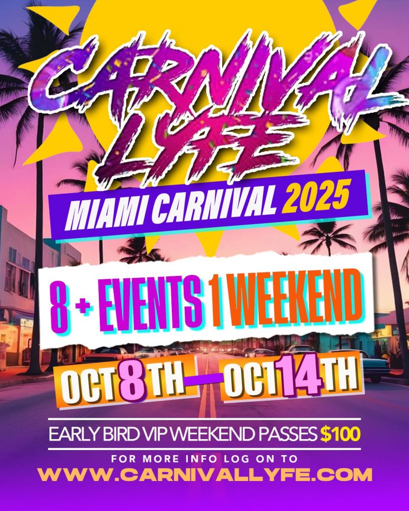 Back To Previous Page CARNIVALLYFE WEEKEND RETURNS TO MIAMI ON OCTOBER 8TH – 14TH 7+ MAIN EVENTS FOR EARLY BIRD VIP WRISTBANDS – LIMITED $100 vip TICKETS AVILABLE WRIST BANDS INCLUDE ACCESS TO ALL OUR EVENTS THAT WEEKEND PLUS A GOODIE BAG !!!